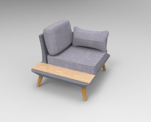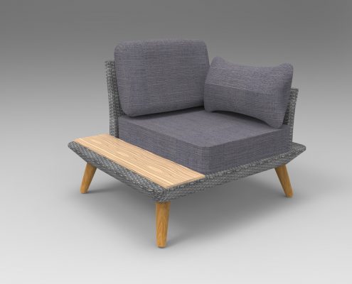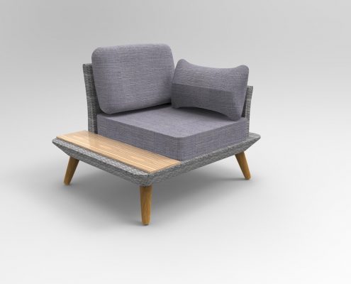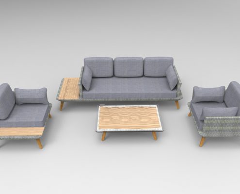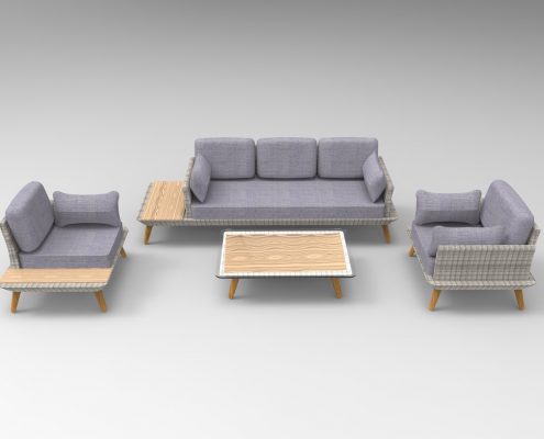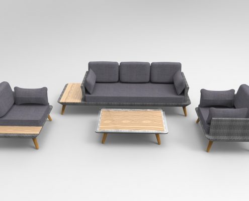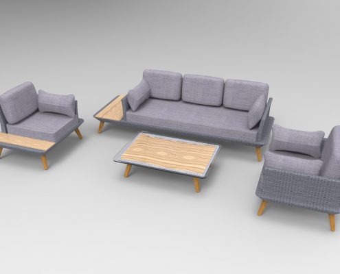 The mix of materials makes this set special. It is made of polyrattan, modern grey cushioning and wood. This wooden surface is added onto the side of the sofa and corner armchair and has a matching coffee table. The legs of the furniture are also made with a wooden finish.