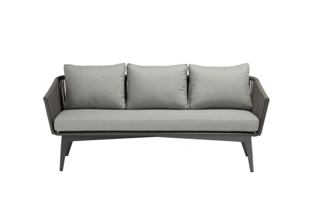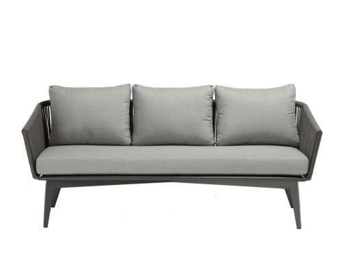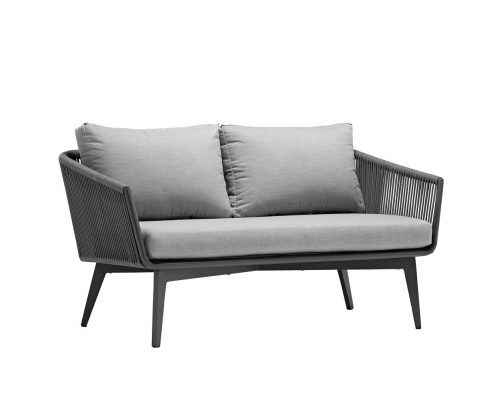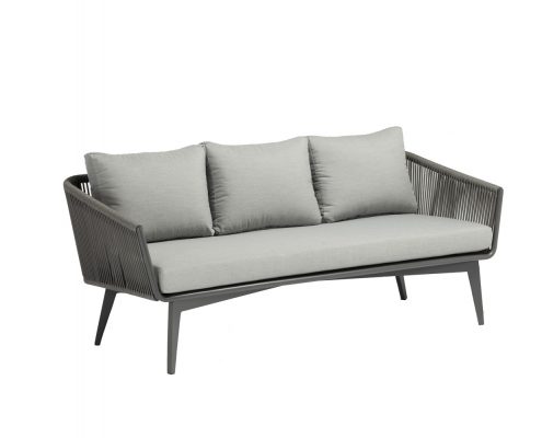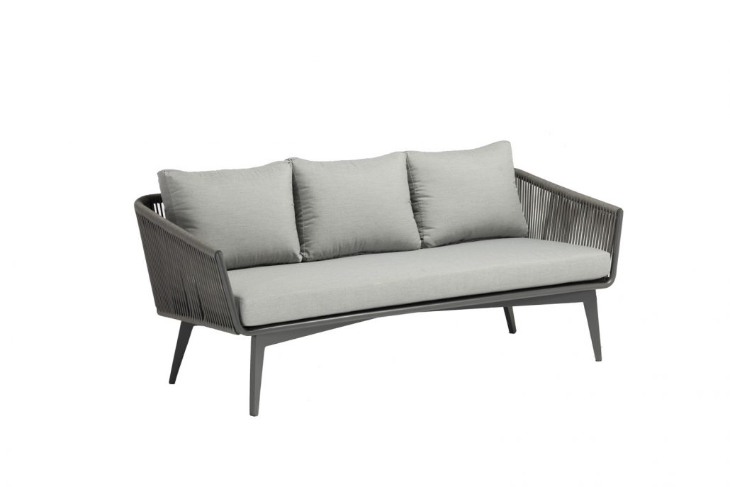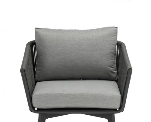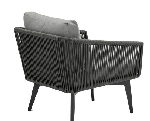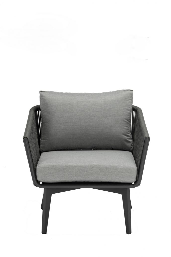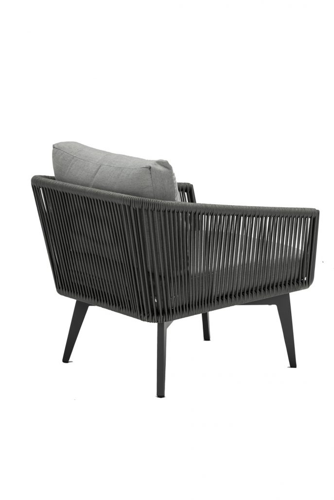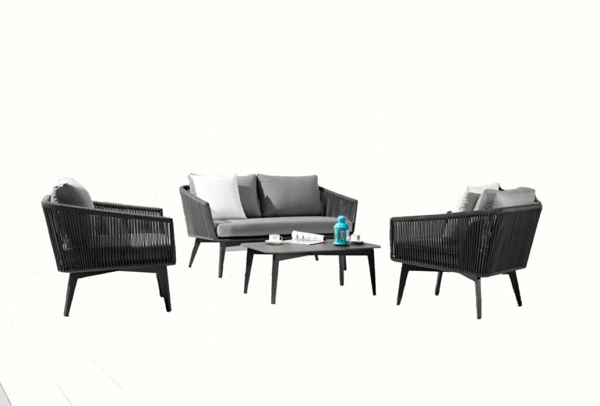 The modern and smart rope-design is a seating group which is not only an absolute eye-catcher for both terrace or garden, but also very comfortable seating comprising of an armchair, a 2-seater and a 3-seater sofa with matching coffee table and stool.