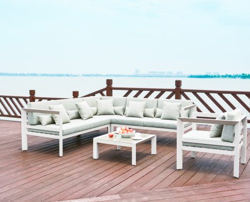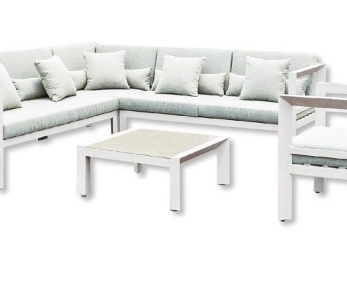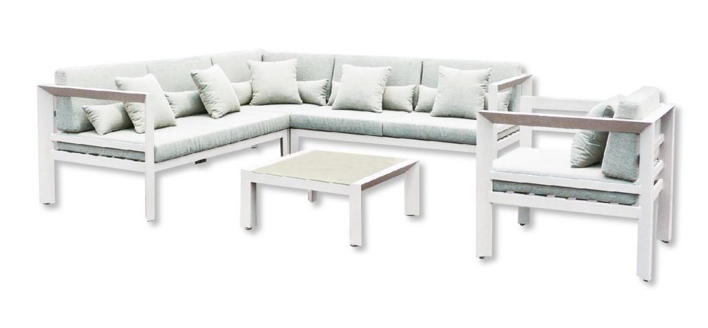 It is spacious and comfortable with a white aluminium frame and fashionable grey cushioning.