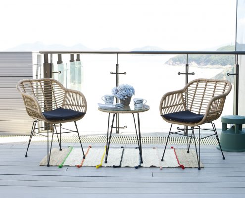 This fashionable rope set offsets any balcony.  Two chairs with matching petite table in a combination of materials.
