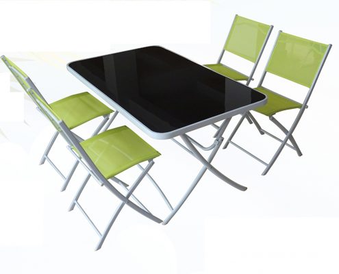This attractive set of 4 chairs and table has a silver steel frame combined with the modern fabric textilene which is very comfortable. A lightweight and flexible folding set for the patio or balcony.