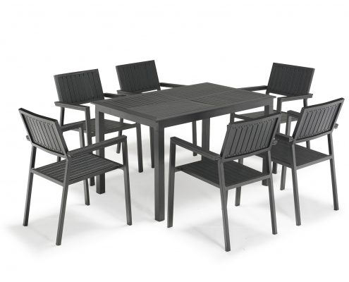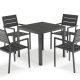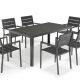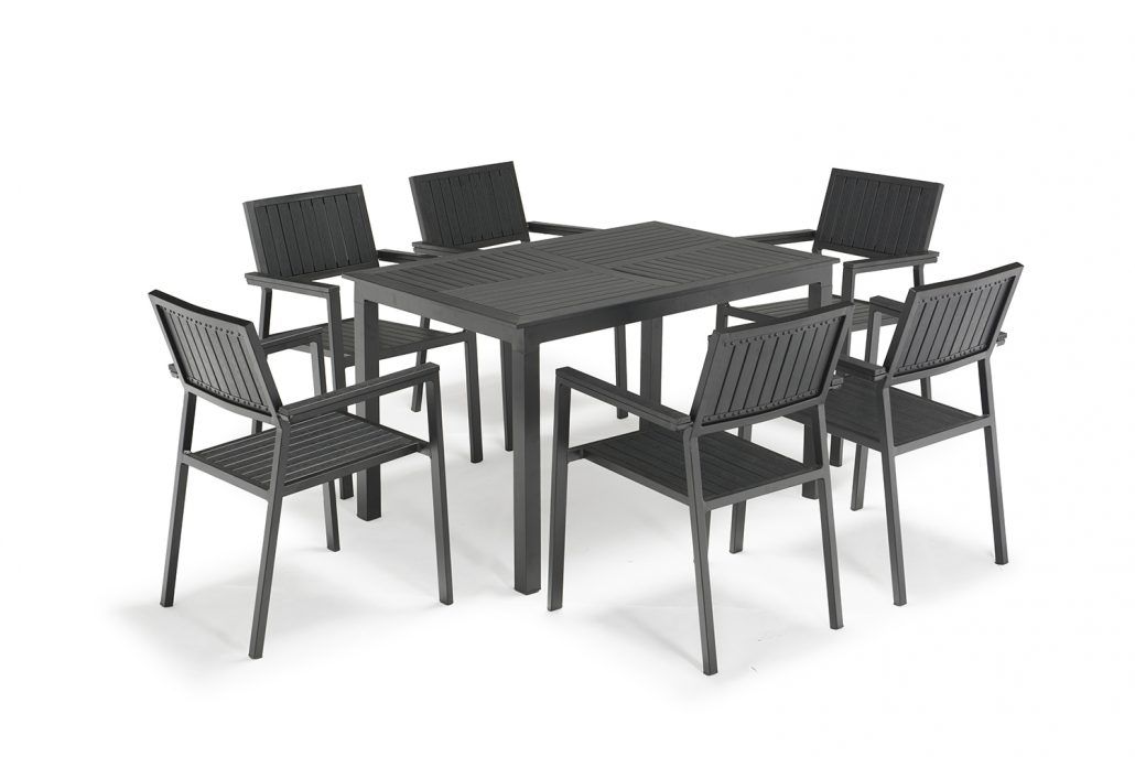 This practical set offers seating for 6 people plus table. It is easy to maintain and light to move around made of plywood with an aluminium frame.