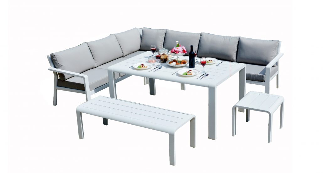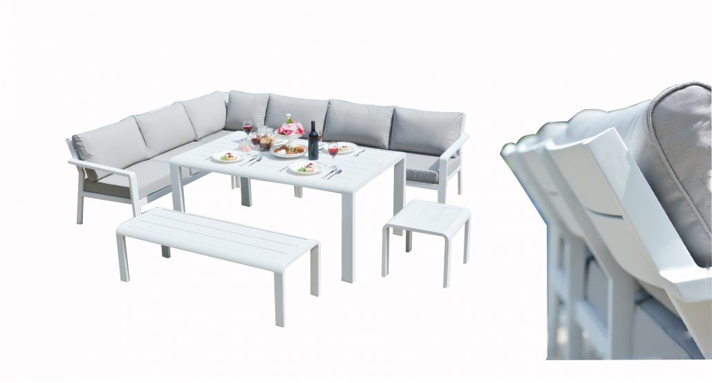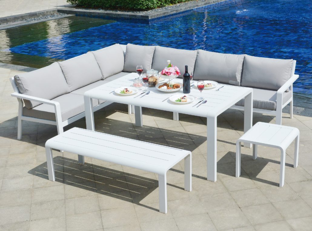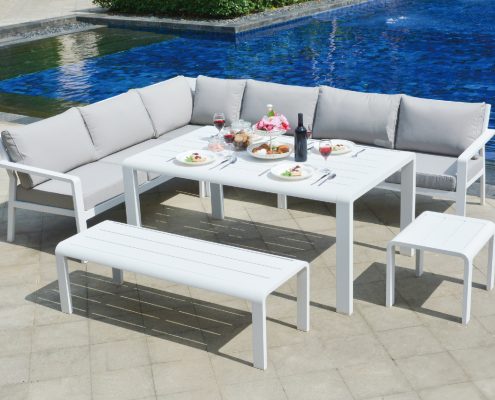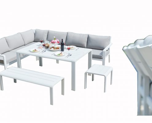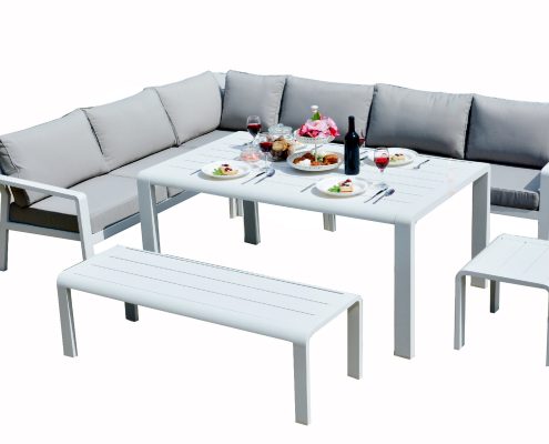 The modern and comfortable look and feel of this set creates the focal point in any terrace or garden. The modern, light and easy to maintain components provide a comfortable corner seat arrangement with 2-seater sofas on either side and focal corner seat. With the additional bench, stool and rectangular table, this set provides sufficient seating for a small group of people meeting informally.