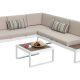 This elegant outdoor set is ideal for both business and pleasure. It combines aluminium with polyrattan and fabric for cushioning.