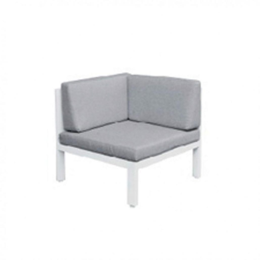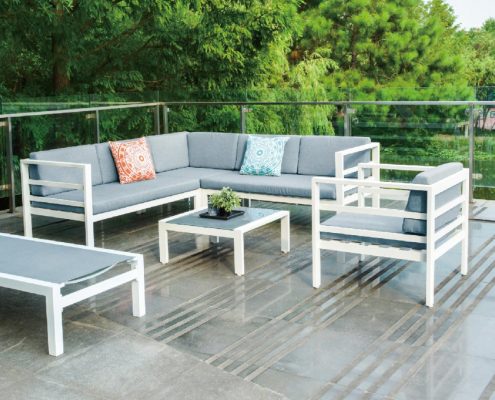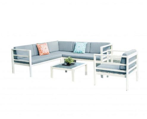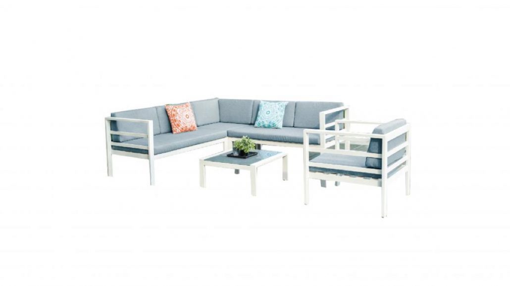 Dieses smarte und kompakte Gartenset mit einem Ecksofa besteht aus einem Aluminiumgestell und grauen Auflagen für Sitzmöglichkeiten bis zu 6 Personen.