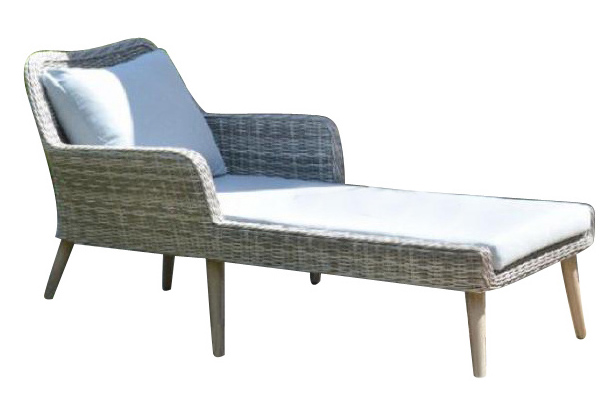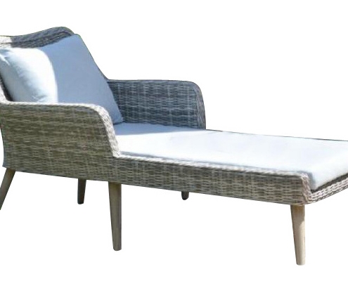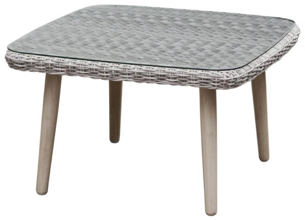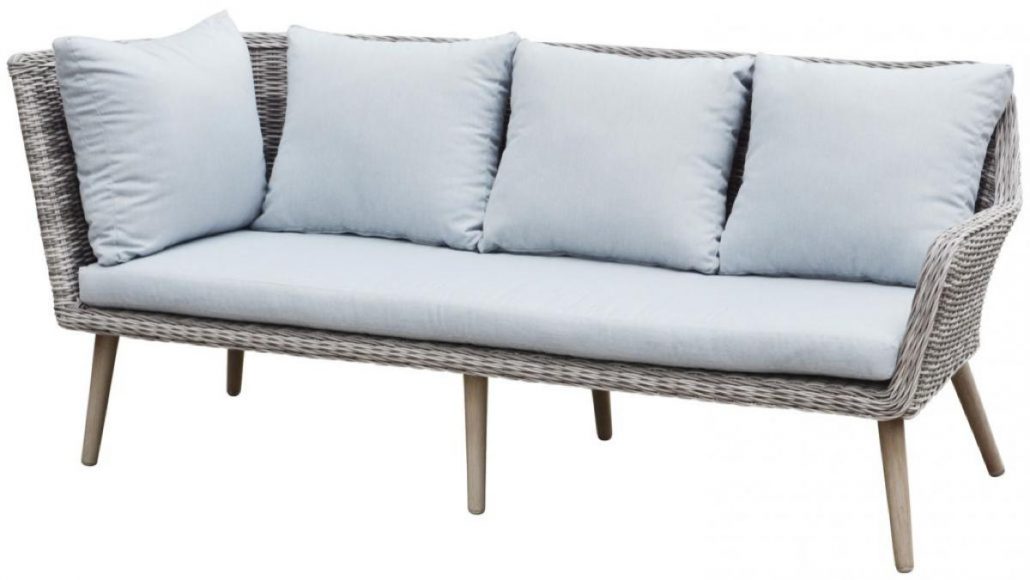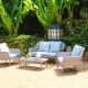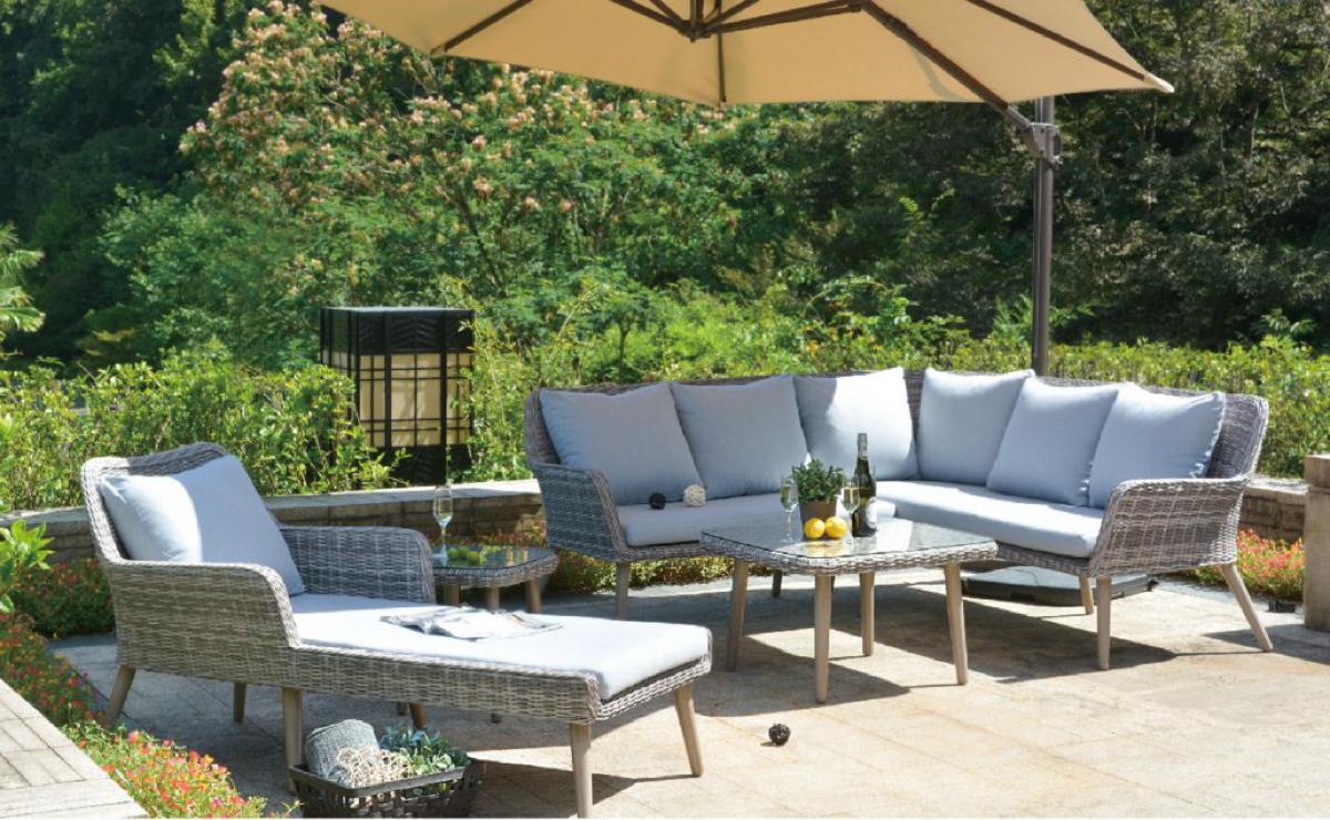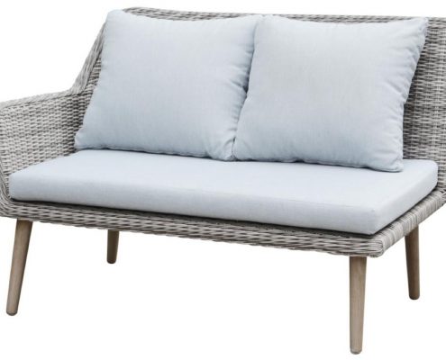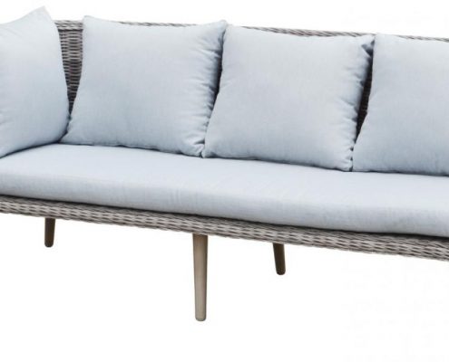 Dieses komfortable Gartenset in einem hellen Polyrattan umfasst eine Ecksofa Kombination aus einem 2- und 3 Sitzer mit einem Beistelltisch.