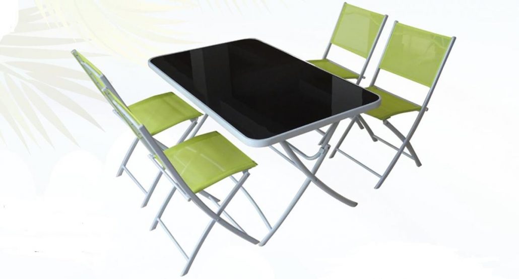 Dieses 5-teilige Gartenset umfasst 4 klappbare Stühle und einen klappbaren Tisch. Die Kombination aus dem schwarzen Tisch und den grünen Stühlen bringen einen Kontrast und „pepp“ in das Gartenset.