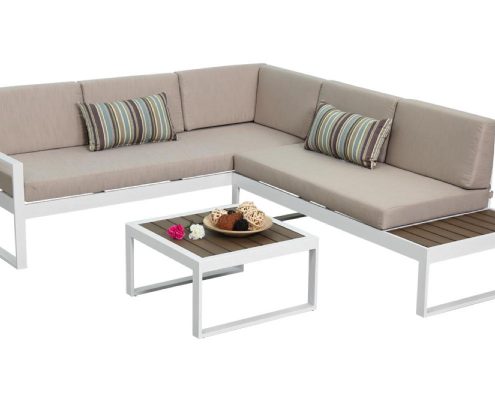 • Weißes Aluminiumgestell mit beigen Auflagen und brauem Polywood