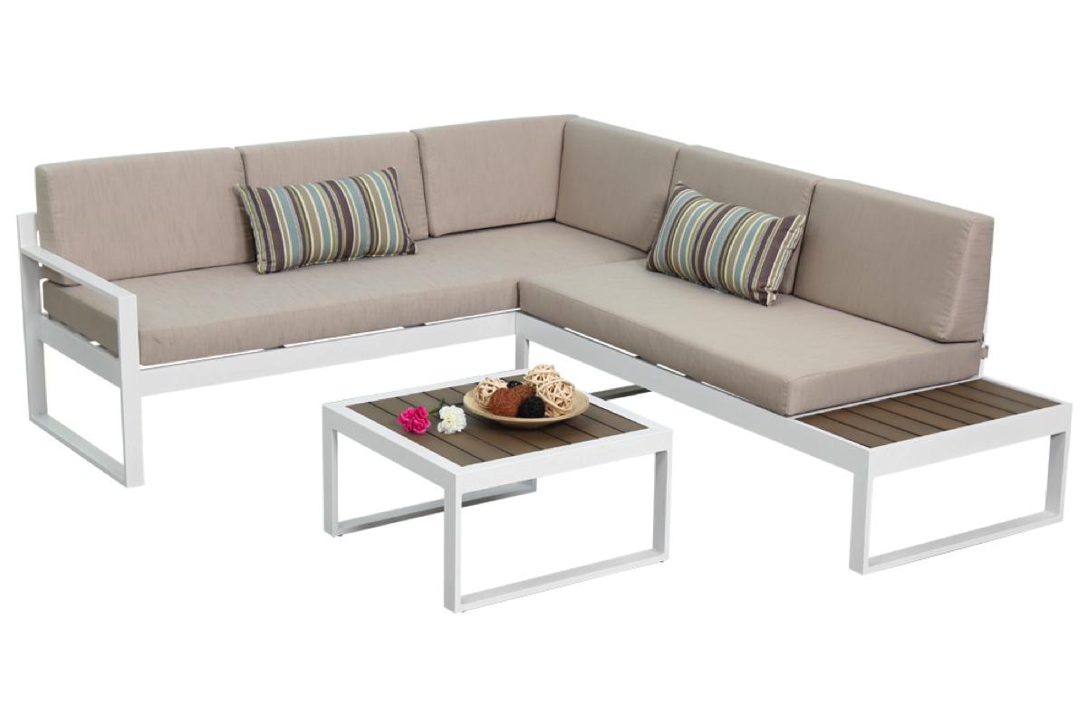 Das stylische Gartenset aus einem Materialmix, bestehend aus einem weißen Aluminiumgestell, braunem Polywood und eleganten beigen Auflagen, ist passend für jeden Garten und ist der optimale Begleiter für schöne Sommerabende mit Freunden und Familie.