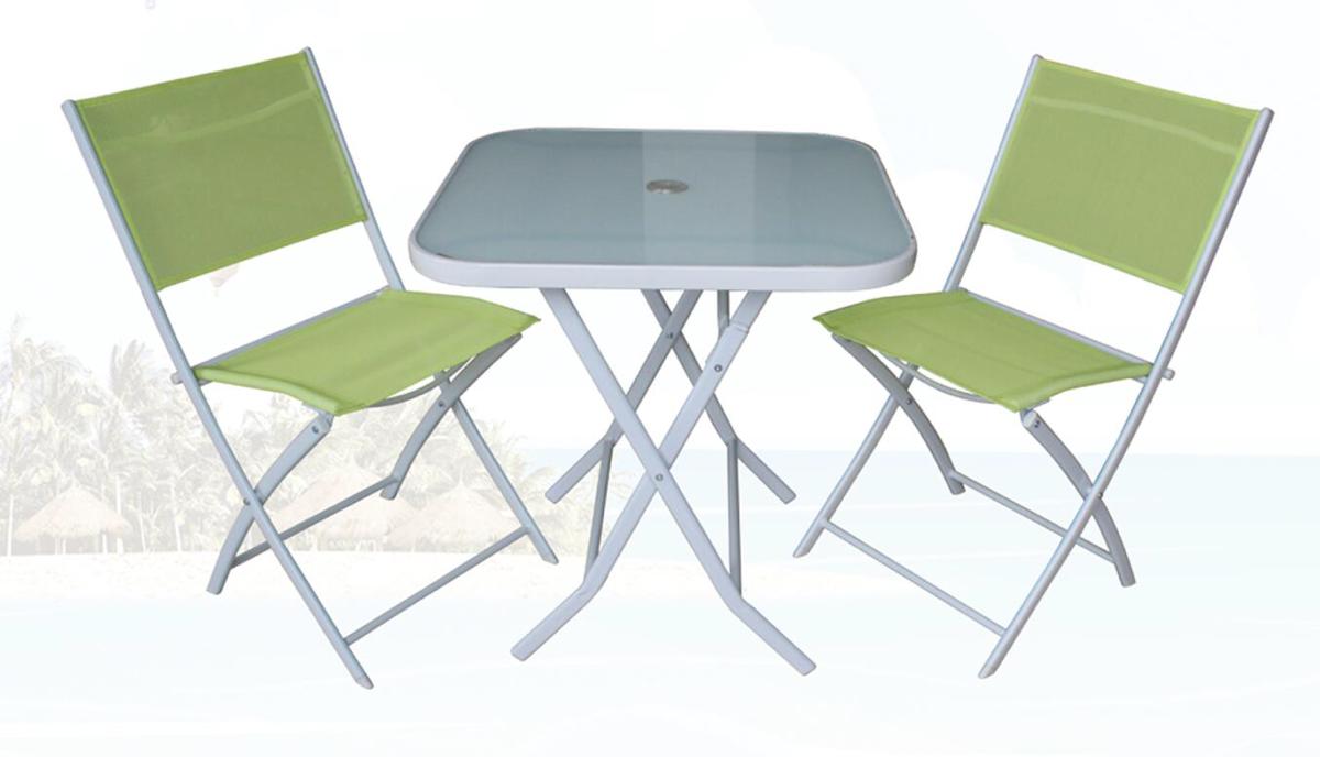 Es umfasst zwei klappbare Stühle und einen klappbaren Tisch.