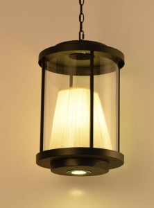 Diese Laterne ist elegant und leicht und kann mit der Kette von der Decke aufgehängt werden. Sie hat einen schwarzen Metallrahmen in Kombination mit transparentem Glas und Mattglas wie im Foto.