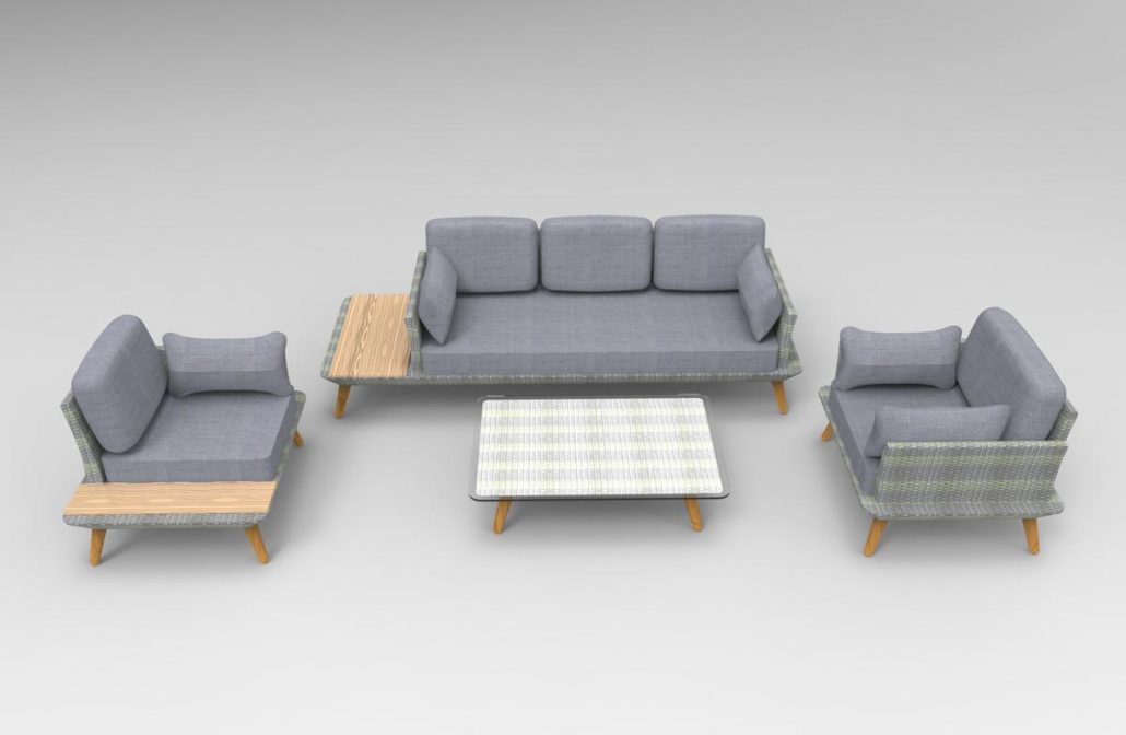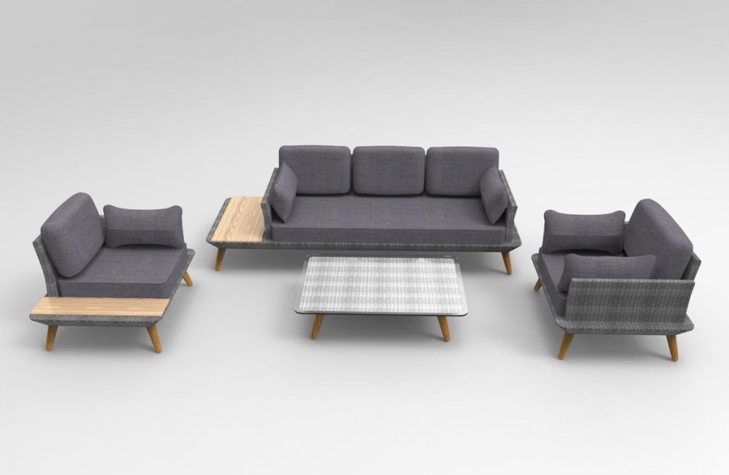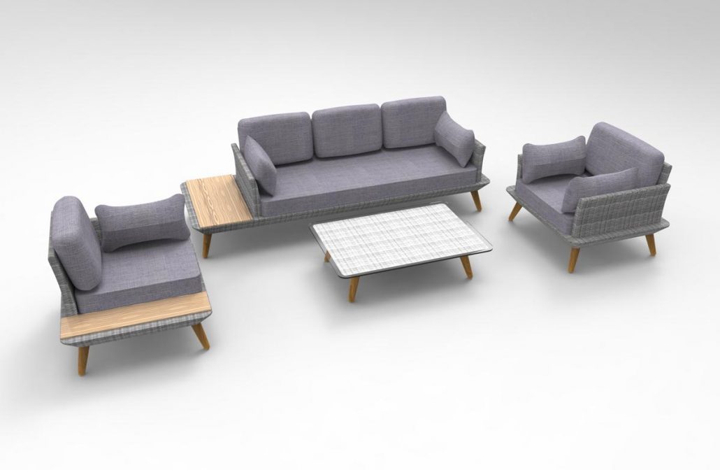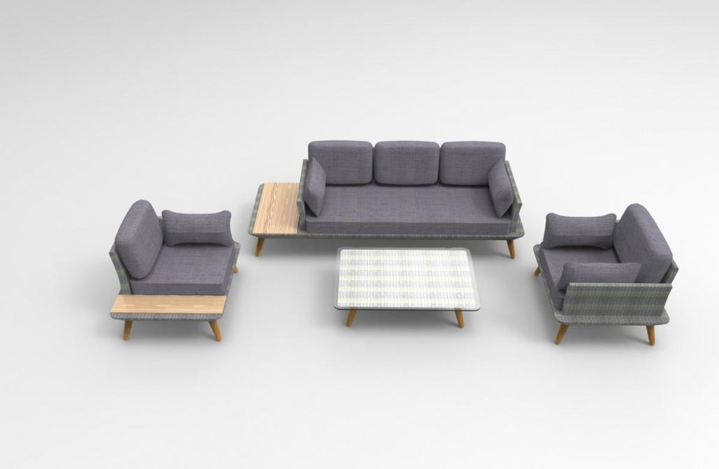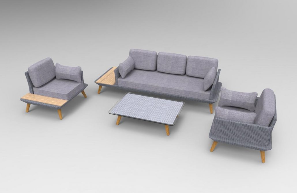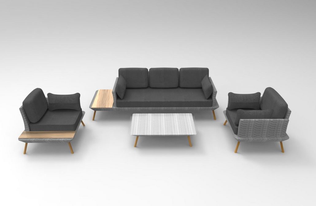 Die Besonderheit hierbei ist der Materialmix. Es besteht aus Polyrattan, modernen grauen Auflagen und einer Holzoptik, die jeweils am Sofa und am Ecksofa als Beistelltisch fungieren. Ebenso spiegelt sich dies auch im Tisch wieder. Die Beine der Möbel sind ebenfalls in einer Holzoptik verarbeitet worden.