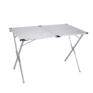 Rechteckiger Campingtisch mit gekreuzten Beinen. Die Tischplatte besteht aus Latten aus Aluminium. Er is leicht zu tragen, zusammenzuklappen und zu lagern. Kommt mit Tragetasche.