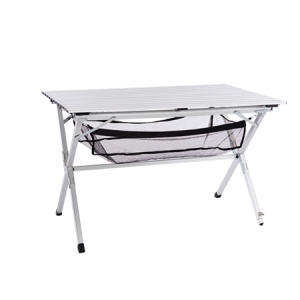 Rechteckiger Campingtisch mit Tischplatte, die aus Latten aus Aluminium besteht. Die gekreuzten Beine bestehen auch aus Aluminium. Zusätzlich gibt es ein Speichernetz, das aufgehängt werden kann. Der Tisch kann leicht zusammengeklappt werden und er ist leicht zu tragen. Kommt mit Tragetasche.