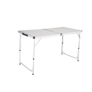 Rechteckiger Campingtisch mit MDF-Tischplatte und U-förmige Beine. Der Rahmen besteht aus Aluminium. Leicht zusammenzuklappen und zu tragen. Kommt mit Tragetasche,